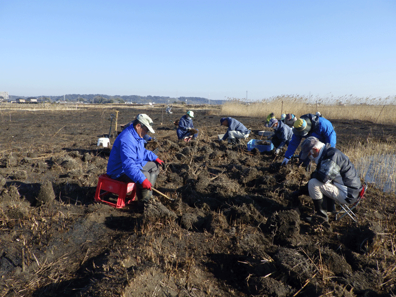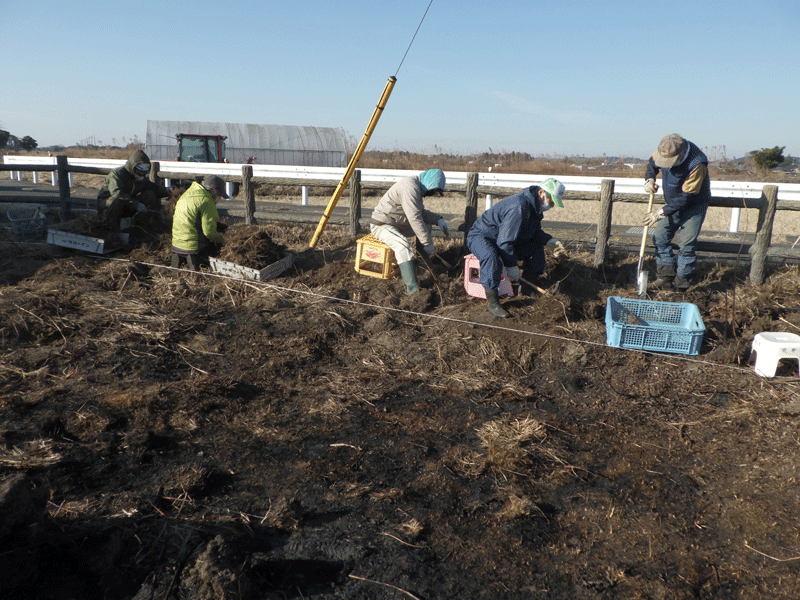 (ススキ株の土落とし作業)